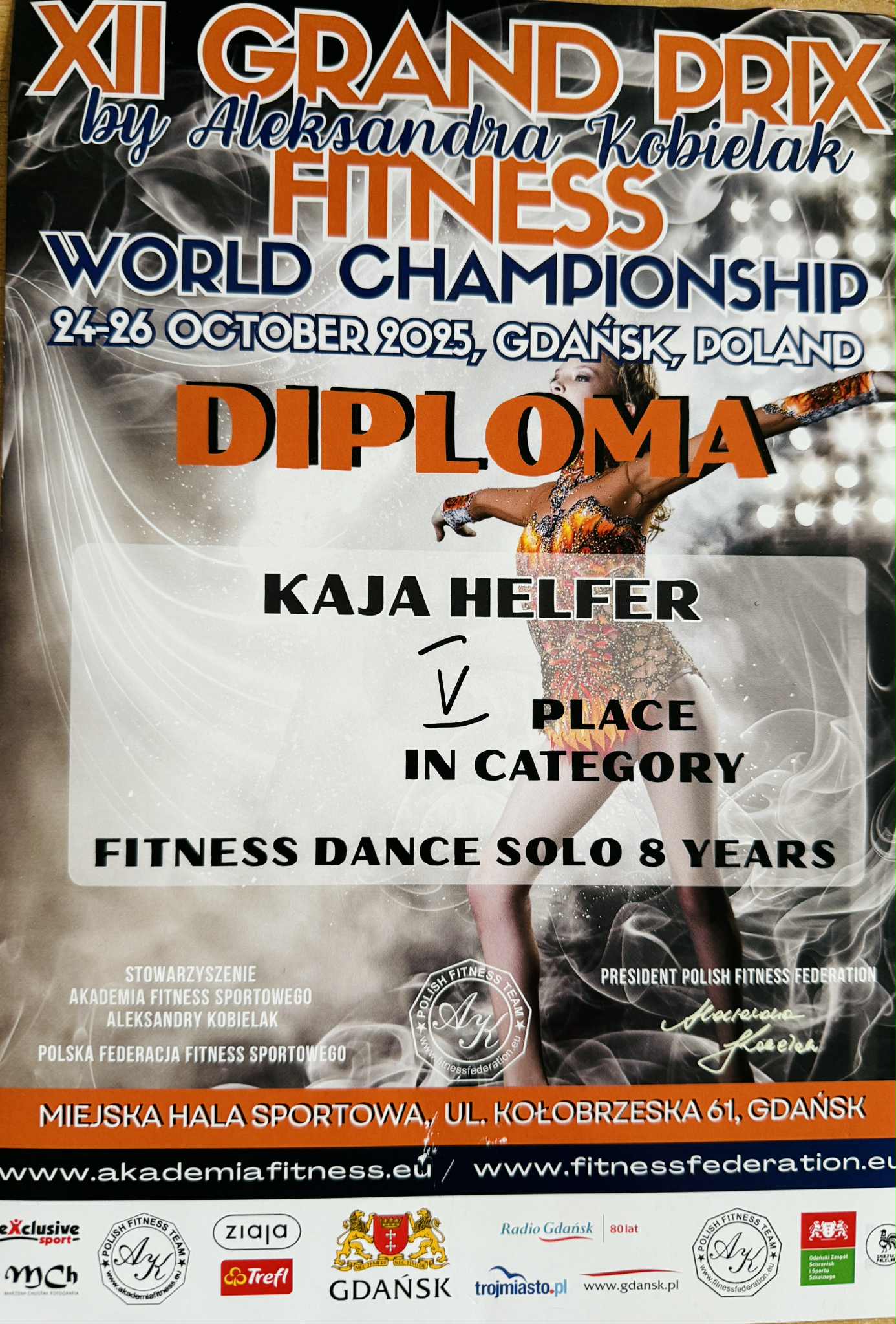 W dniach 24–25 października 2025 w Gdańsku odbyła się XII edycja Grand Prix Fitness World Championship – prestiżowe zawody gromadzące najlepszych młodych sportowców z kraju i zagranicy. W rywalizacji wzięła udział uczennica z naszej szkoły – Kaja Helfer (z klasy 2a),  reprezentując Szkołę Gimnastyczną Konstancji Iwańczyk w Sanoku. Młoda zawodniczka zaprezentowała się znakomicie!