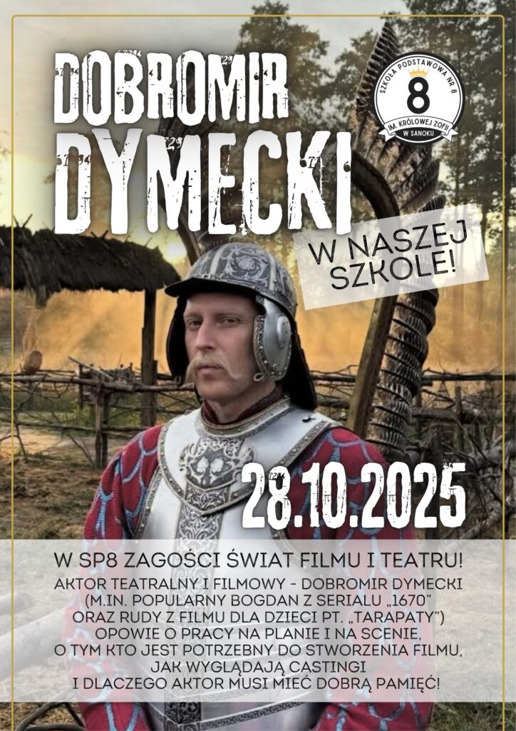 28 października 2025 r. naszą szkołę odwiedzi Dobromir Dymecki, aktor teatralny i filmowy – znany z wielu ról w polskich produkcjach scenicznych, telewizyjnych i kinowych – który przybliży uczniom tajniki swojego zawodu, opowie o swojej drodze artystycznej, doświadczeniach zdobytych na scenie i planie filmowym.