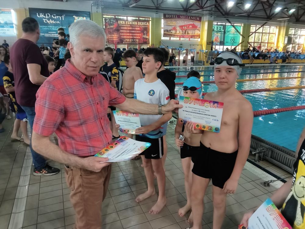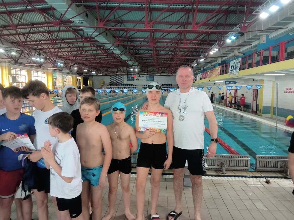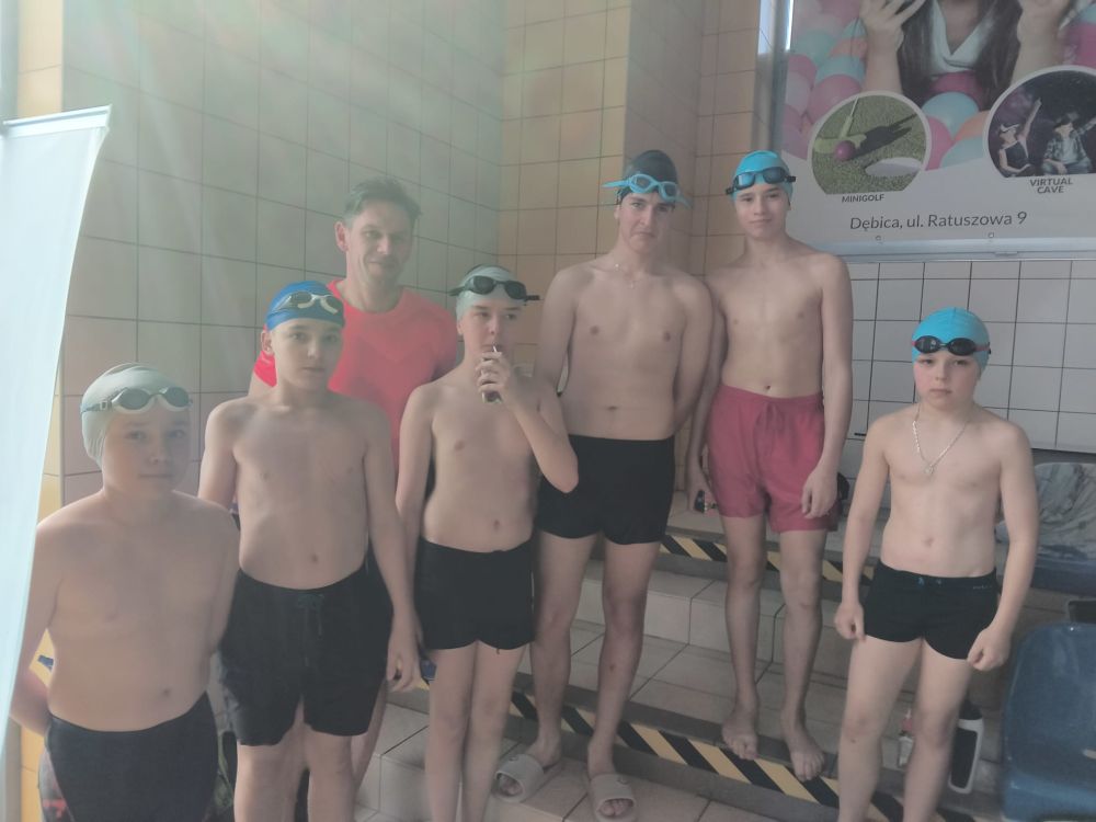 Nie zawiodła nas również nasza męska sztafeta w składzie Bruno Kobiałka i Aleksander Doskowski z klasy 5 oraz reprezentanci klasy sportowej pływackiej Dagmar Bednarz, Igor Ustianowski, Sławomir Baran, Krzysztof Klimkowski i Bartosz Struś. 2 miejsce w finale B oraz 8 miejsce ostatecznie w Finale Wojewódzkim chłopców w pływaniu to naprawdę świetny wynik. Warto odnotować poprawę o kilka sekund czasu uzyskanego w półfinale. Jesteśmy dumni z tej drużyny, która z roku na rok osiąga coraz lepsze wyniki. Jesteśmy dumni.