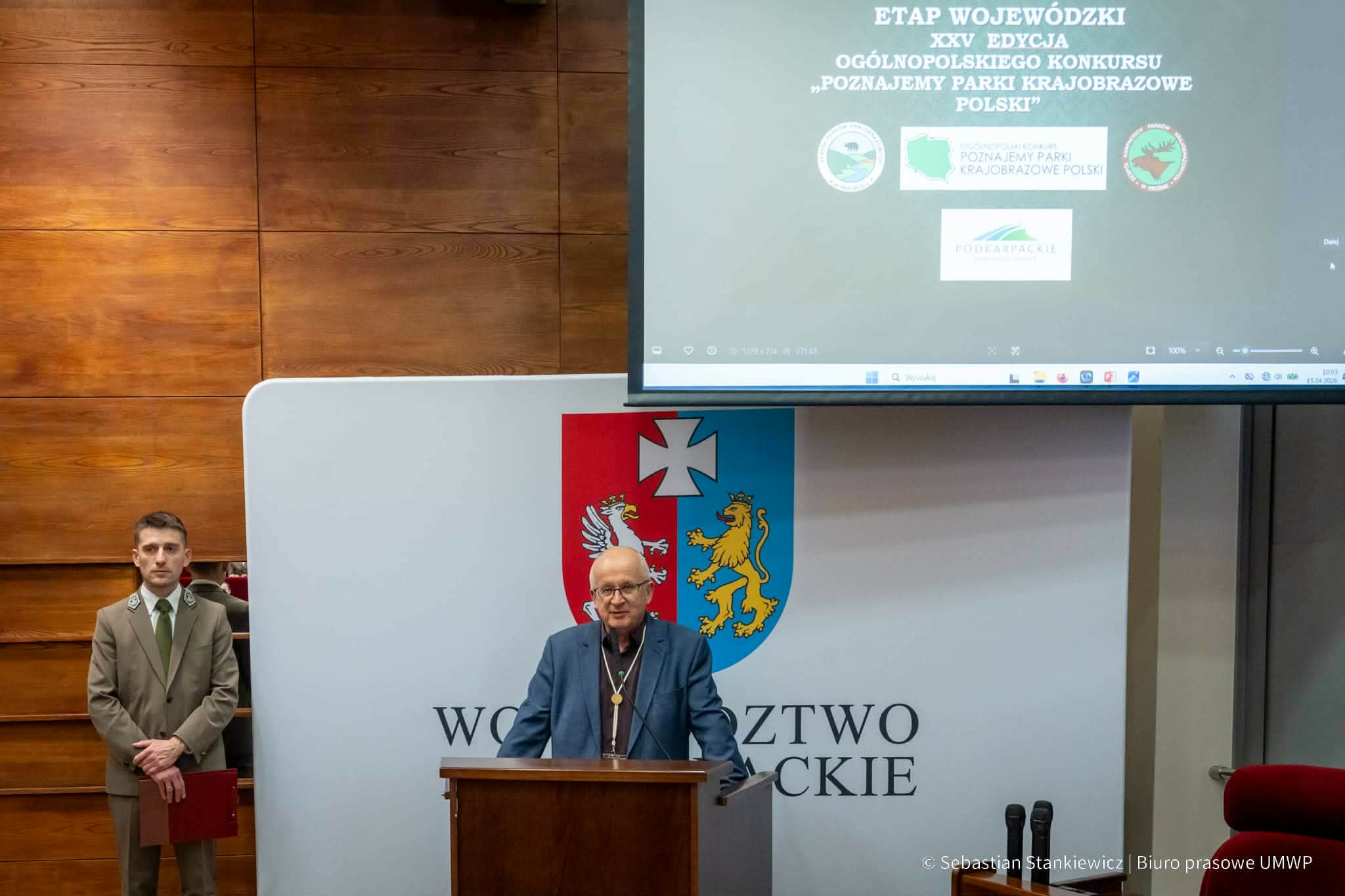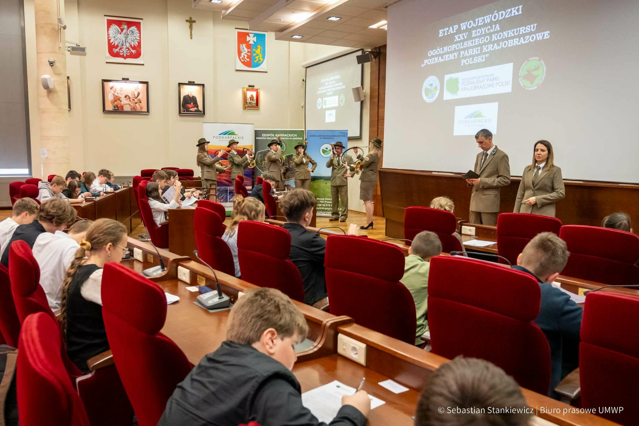 W dniu 15 kwietnia 2026 roku w sali audytoryjnej Urzędu Marszałkowskiego Województwa Podkarpackiego w Rzeszowie odbył się IV etap wojewódzki XXV edycji Konkursu „Poznajemy Parki Krajobrazowe Polski”, podczas którego drużyna z naszej szkoły – w składzie: Jula Czyż (7a), Klara Szwarc (7a) i Weronika Wolanin (7b) – reprezentowała Park Krajobrazowy Gór Słonnych.