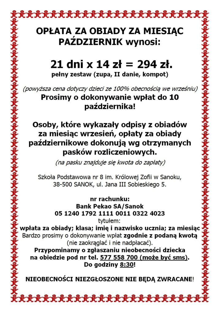 Opłata za obiady we PAŹDZIERNIKU 2025…