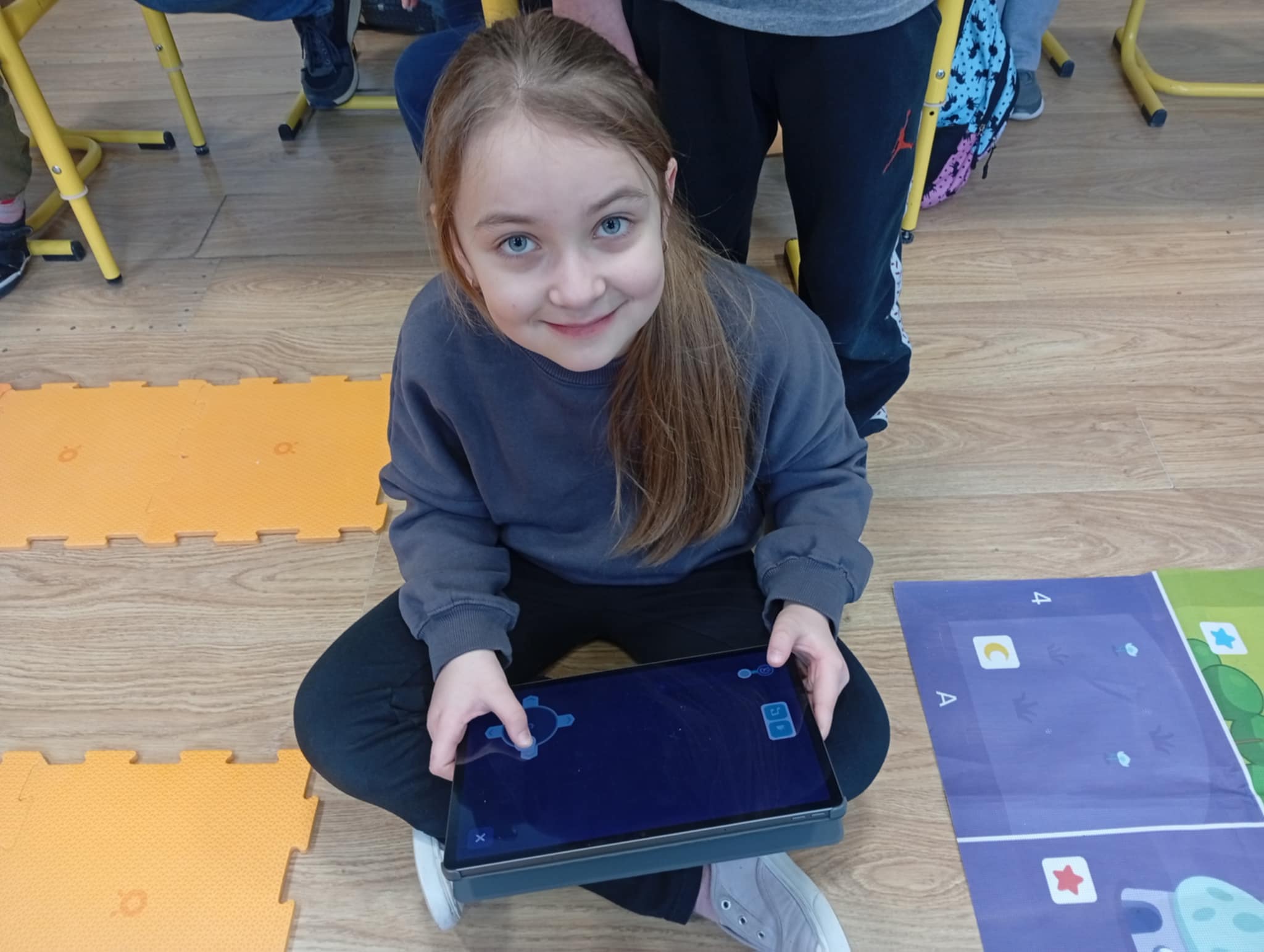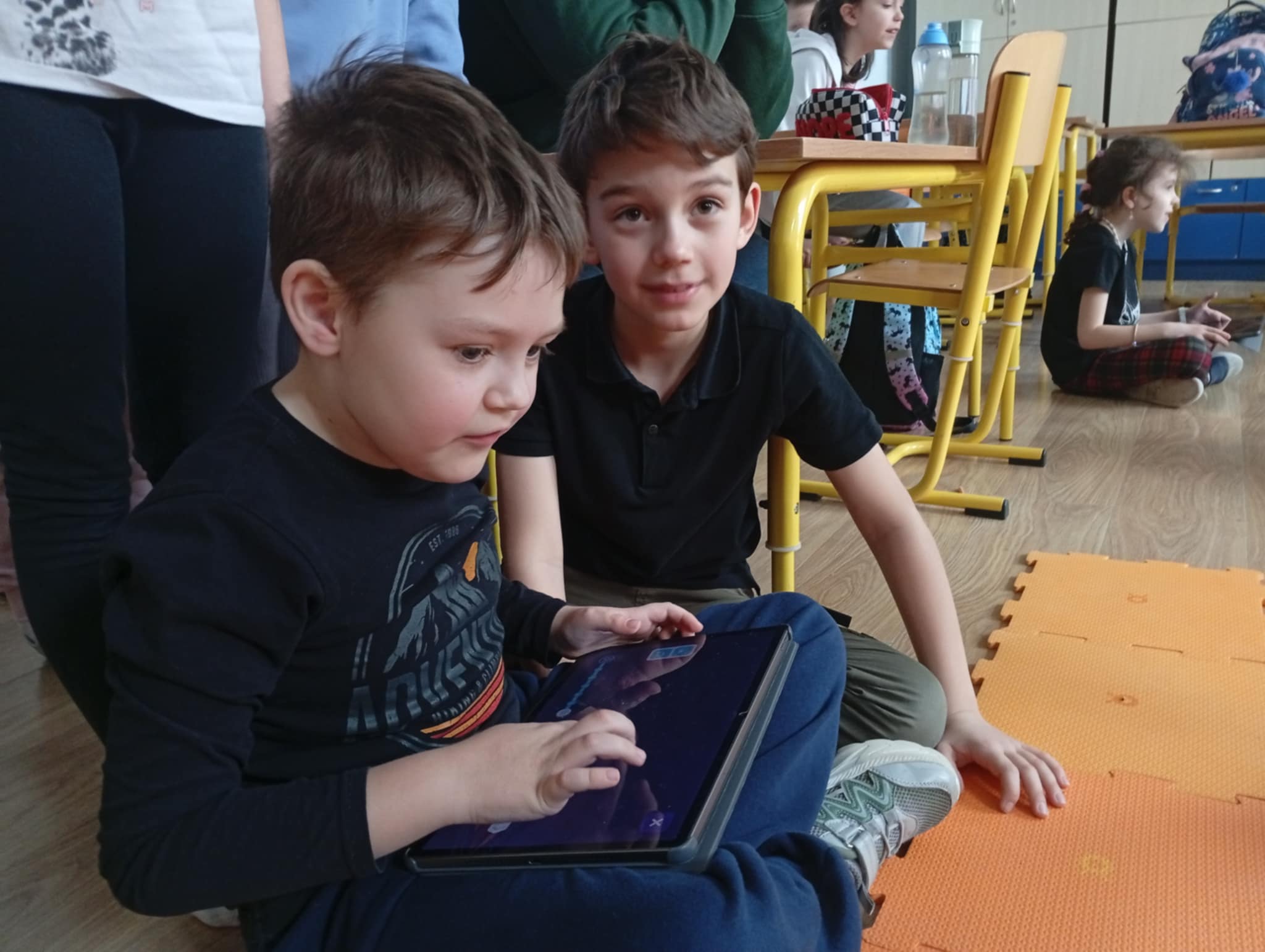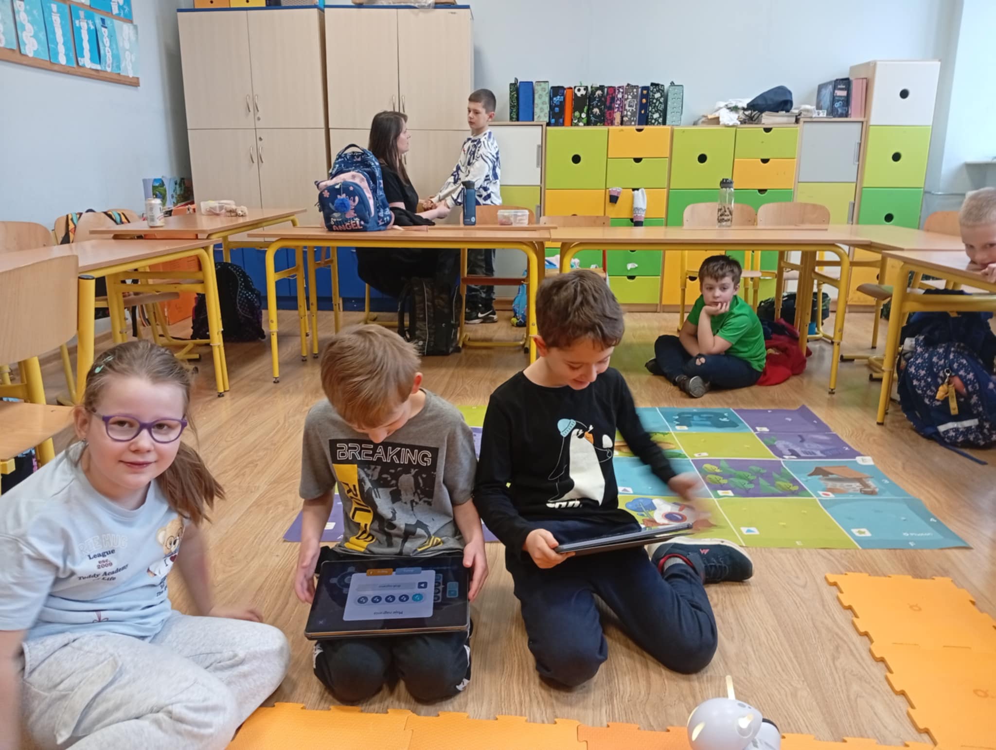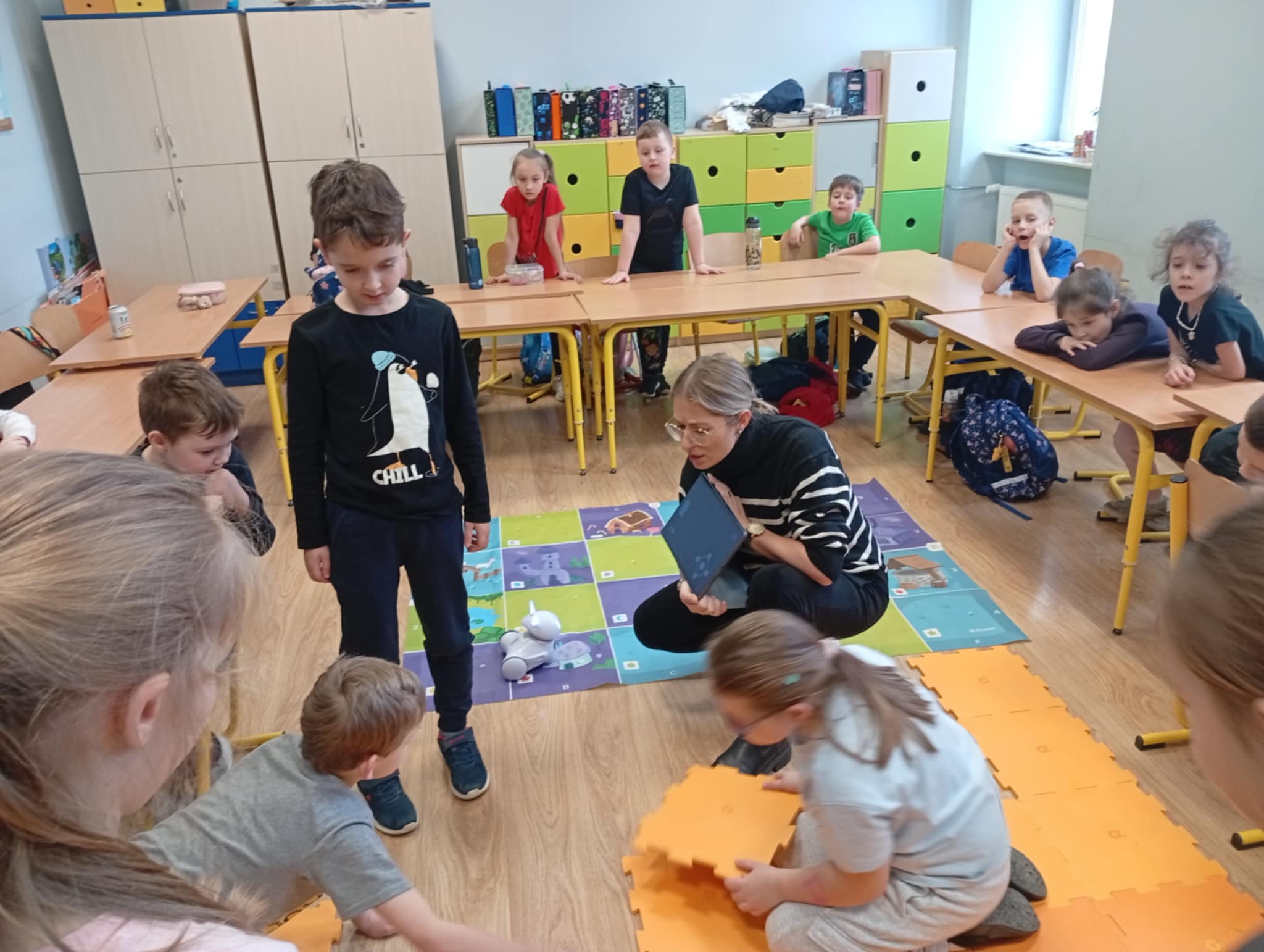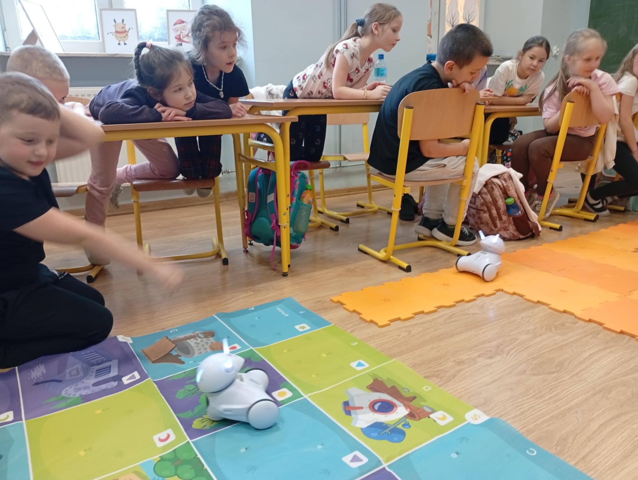 Podczas pierwszej lekcji uczniowie mieli okazję zobaczyć, jak działa robot edukacyjny Photon oraz w jaki sposób można nim sterować za pomocą tabletu. Dzieci obserwowały, jak robot porusza się po sali według zaprogramowanej trasy, zmienia kolory, wydaje dźwięki oraz reaguje na wydawane polecenia. Była to dla nich fascynująca lekcja pokazująca, że programowanie polega na tworzeniu jasnych i logicznych instrukcji, dzięki którym robot „wie”, co ma zrobić.