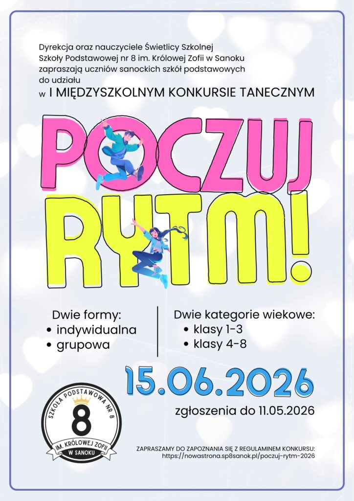 Zapraszamy uczniów sanockich szkół podstawowych do udziału w wyjątkowym konkursie tanecznym „POCZUJ RYTM!”. To świetna okazja, aby zaprezentować swój talent, dobrze się bawić i poczuć prawdziwą scenę! Występy solo lub w grupach. Niezapomniane emocje gwarantowane!