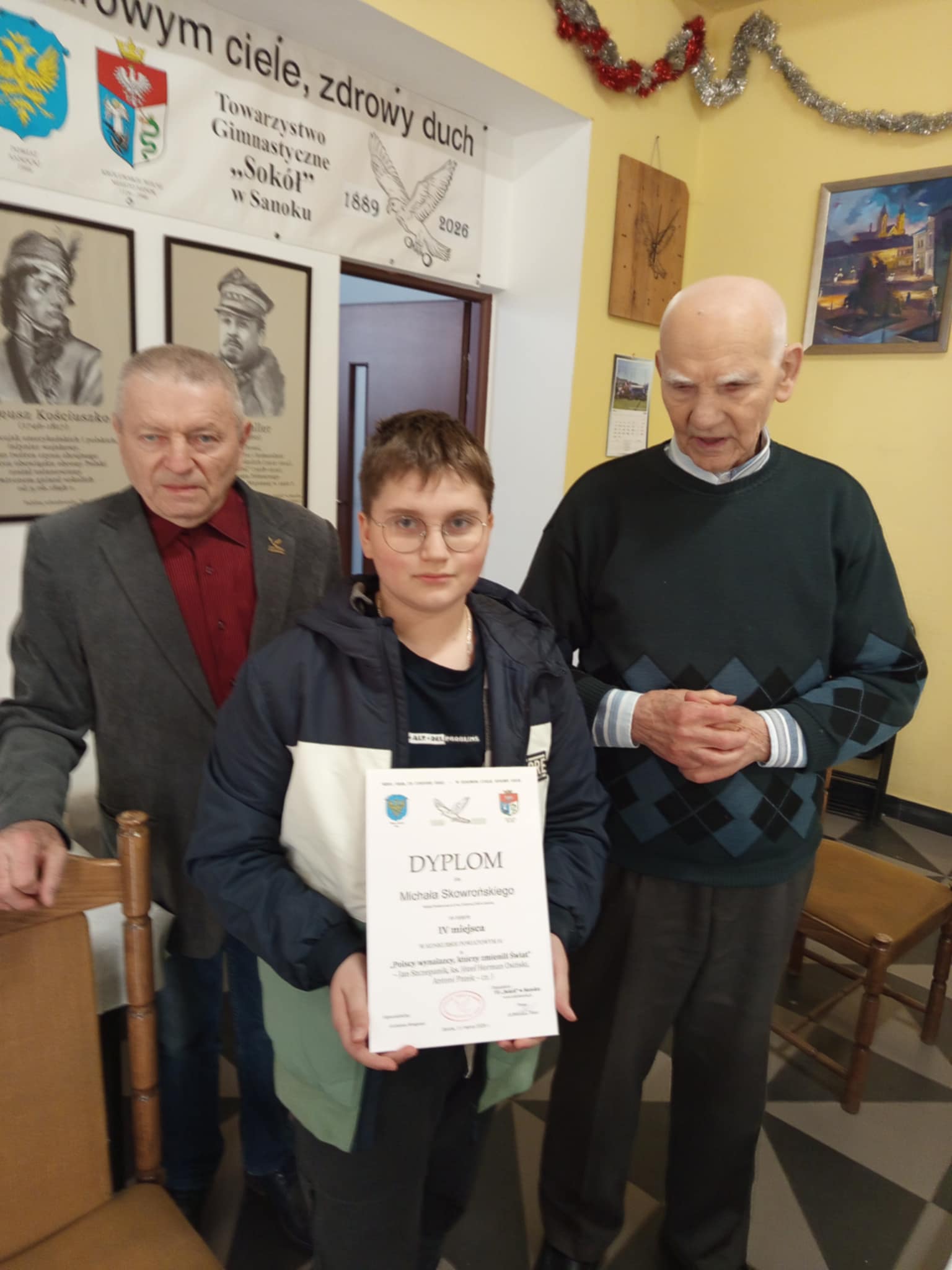 Towarzystwo Gimnastyczne „Sokół” w Sanoku 11.03.2026 roku zorganizowało kolejny konkurs historyczny. Tematyką zmagań konkursowych były postacie trzech wybitnych polskich, naukowych osobowości: Jana Szczepanika, ks. Józefa Osińskiego i Antoniego Płatka. W konkursie wzięli udział uczniowie Szkoły Podstawowej nr 8 im. Królowej Zofii w Sanoku: Ida Wolanin z klasy V B zajęła 13 miejsce, Wojciech Wolanin z klasy V B zajął 14 miejsce, natomiast Michał Skowroński z klasy VI B uplasował się na znakomitym 4 miejscu. Michała osiągnięcie docenione zostało okolicznościowym dyplomem.