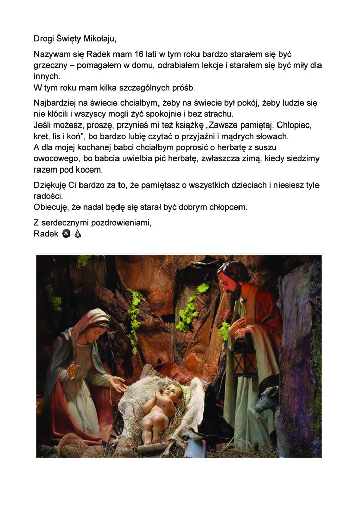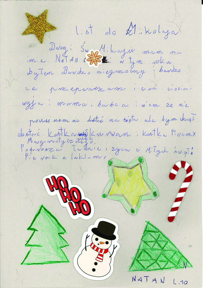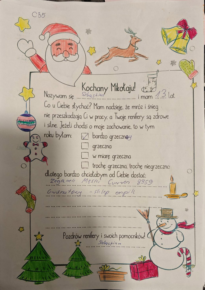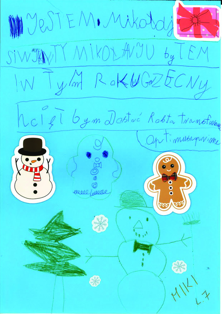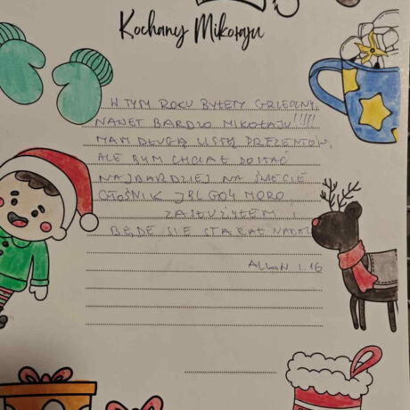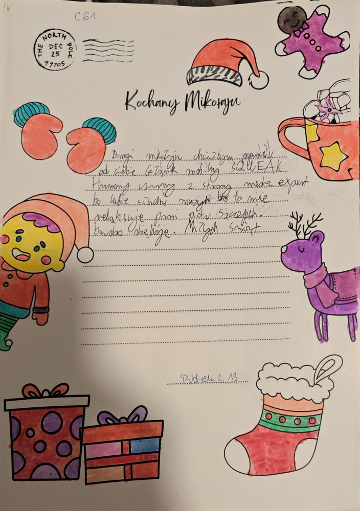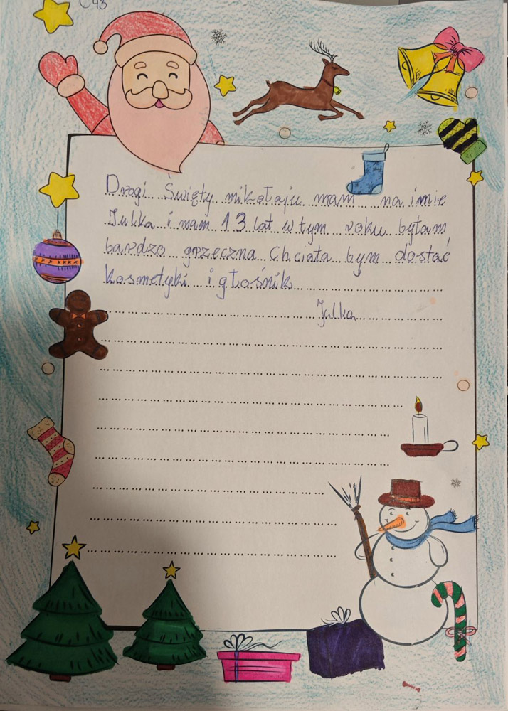 Po uzgodnieniach z wychowawcami klas oraz po akceptacji Oddziałowych Rad Rodziców, każda klasa otrzymała jeden LIST DO MIKOŁAJA z prośbą o prezent o wartości nie większej niż 120 zł. Oczywiście nie stoi nic na przeszkodzie, aby dosypać do prezentów GARŚĆ MIKOŁAJKOWYCH SŁODKOŚCI.