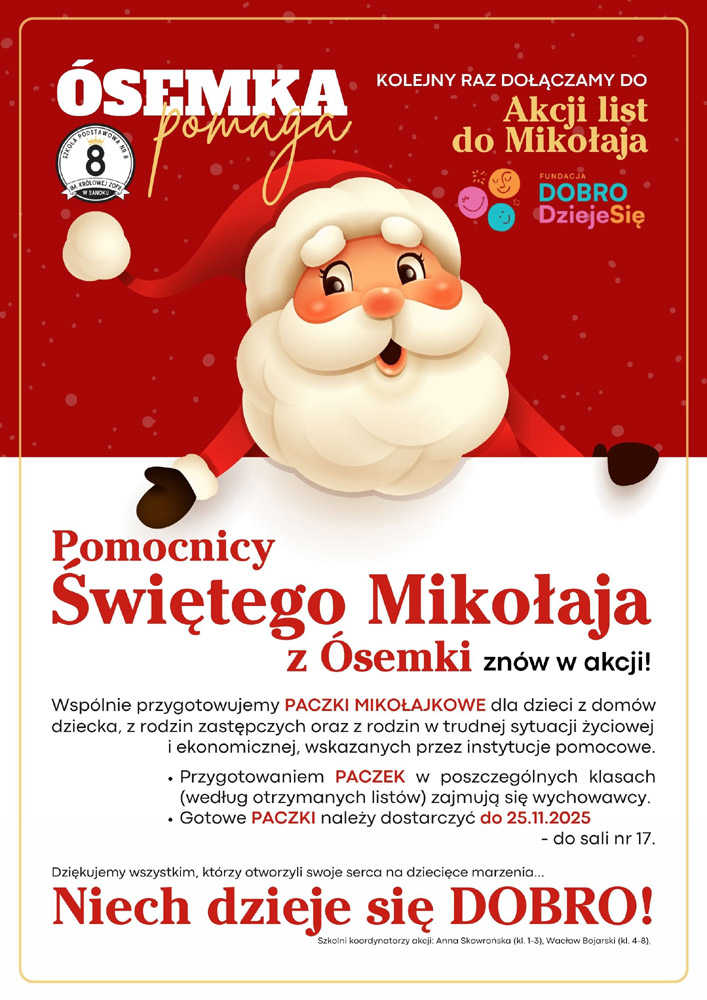 Dziękuję społeczności naszej szkoły, społeczności Szkoły Podstawowej nr 6 im. Jana Pawła II w Sanoku oraz instruktorom Hufca ZHP Ziemi Sanockiej, którzy postanowili ponownie przyłączyć się do Ogólnopolskiej Akcji LIST DO MIKOŁAJA organizowanej przez Fundację DOBRO SIĘ DZIEJE.