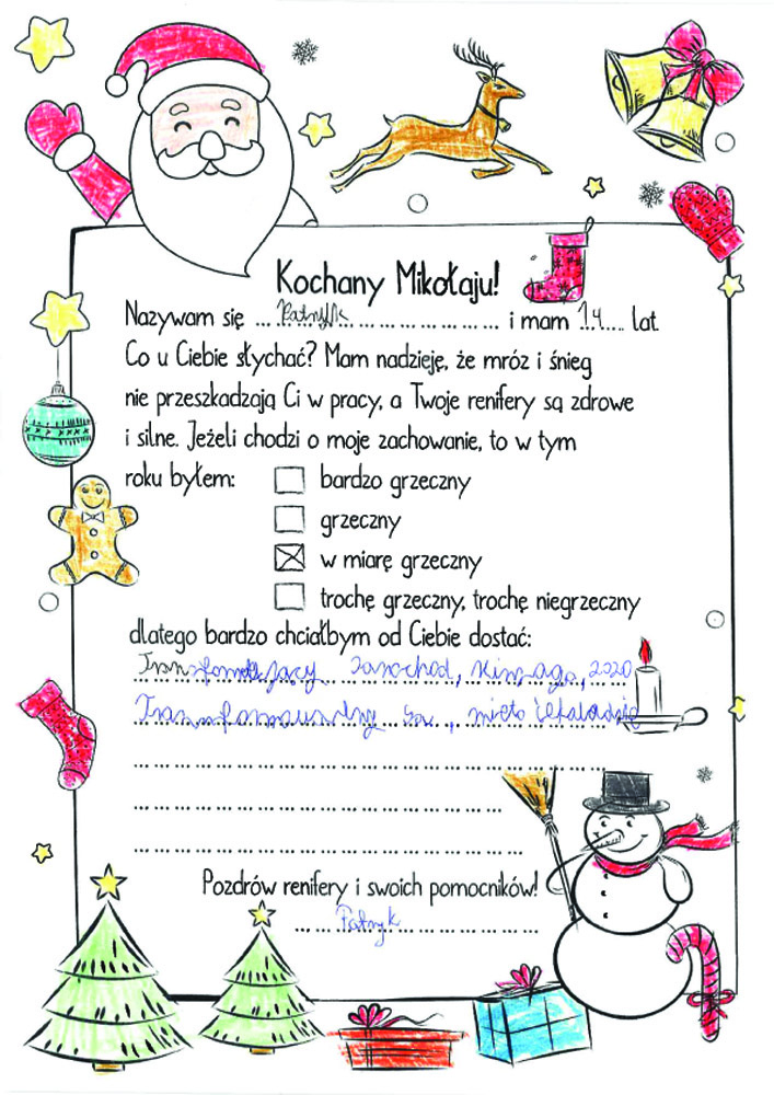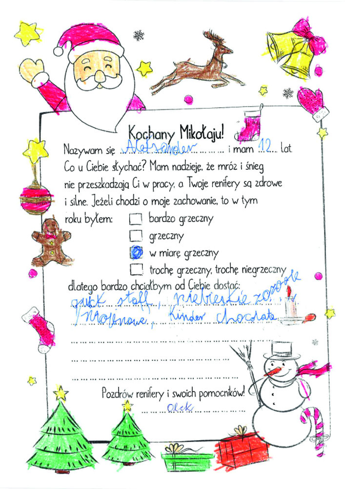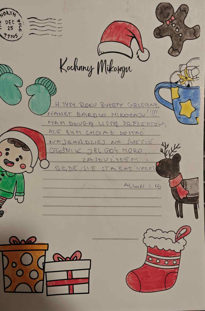 Po uzgodnieniach z wychowawcami klas oraz po akceptacji Oddziałowych Rad Rodziców, każda klasa otrzymała jeden LIST DO MIKOŁAJA z prośbą o prezent o wartości nie większej niż 120 zł. Oczywiście nie stoi nic na przeszkodzie, aby dosypać do prezentów GARŚĆ MIKOŁAJKOWYCH SŁODKOŚCI.