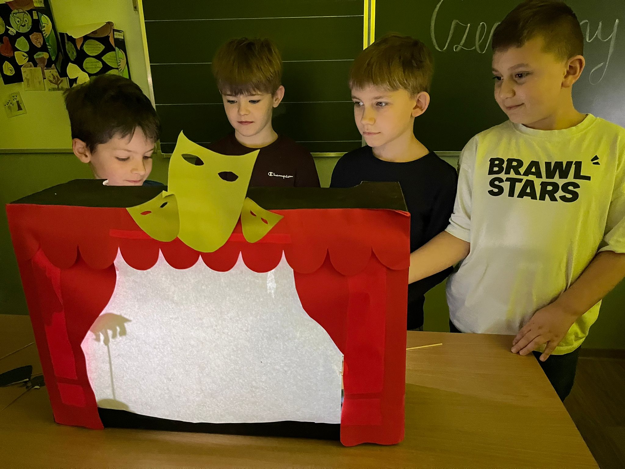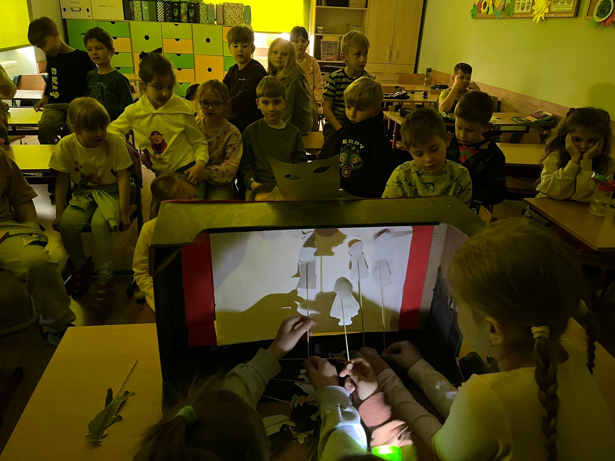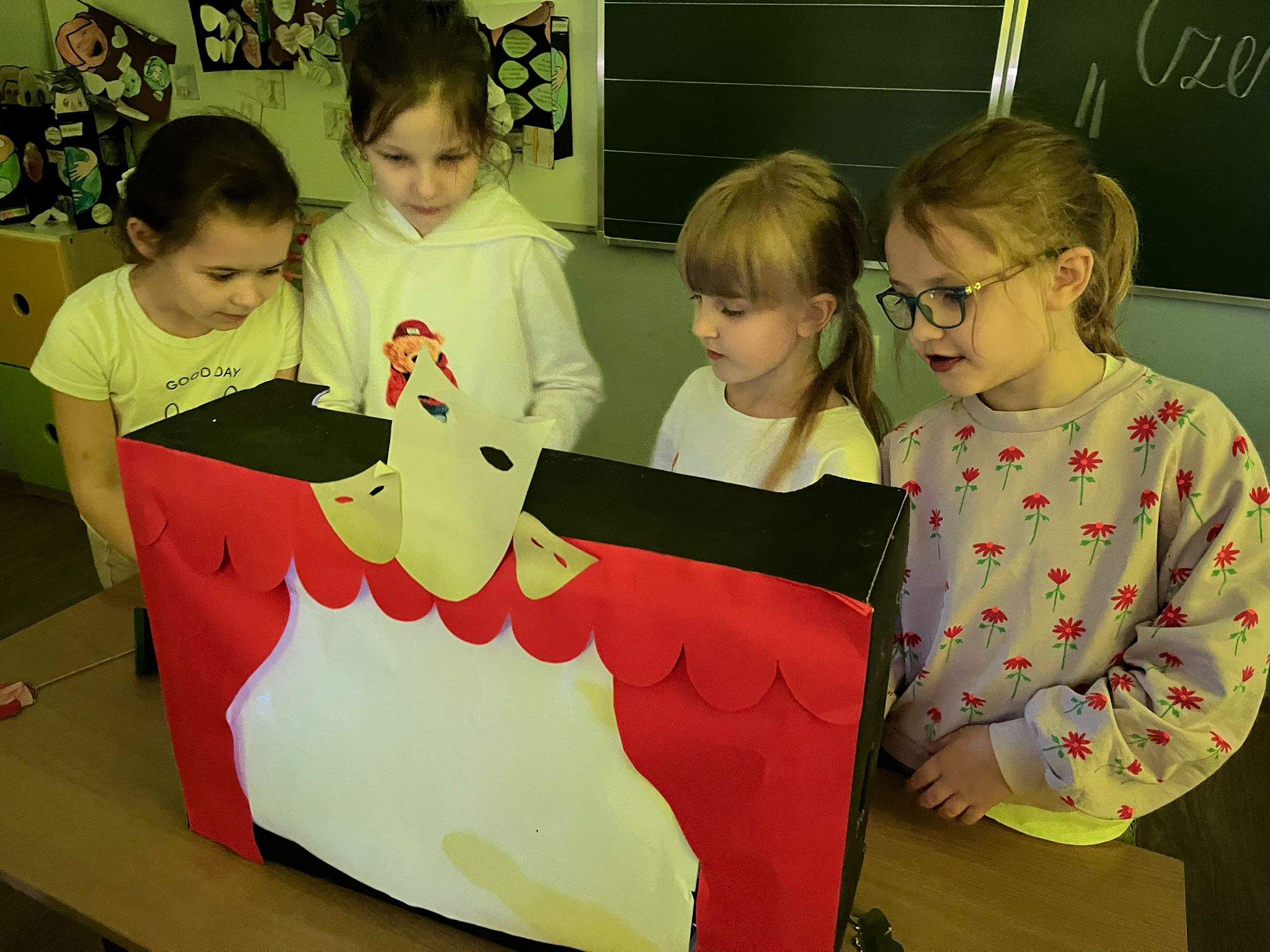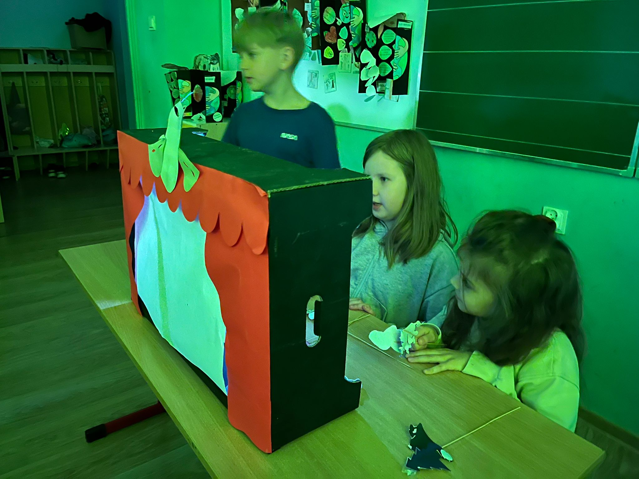 Dzieci podzieliły się na grupy, a każda z nich zaprezentowała swoją wersję przedstawienia, wykorzystując pacynki. Było dużo kreatywności, zaangażowania i świetnej zabawy. Mali aktorzy doskonale wcielili się w swoje role, a każda inscenizacja była niepowtarzalna i pełna pomysłów. Brawo dla wszystkich uczniów za odwagę, współpracę i piękne występy.