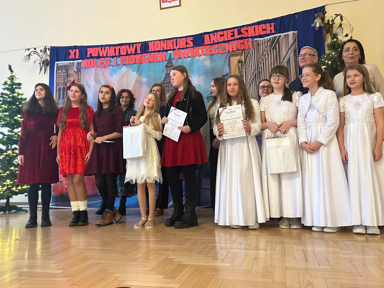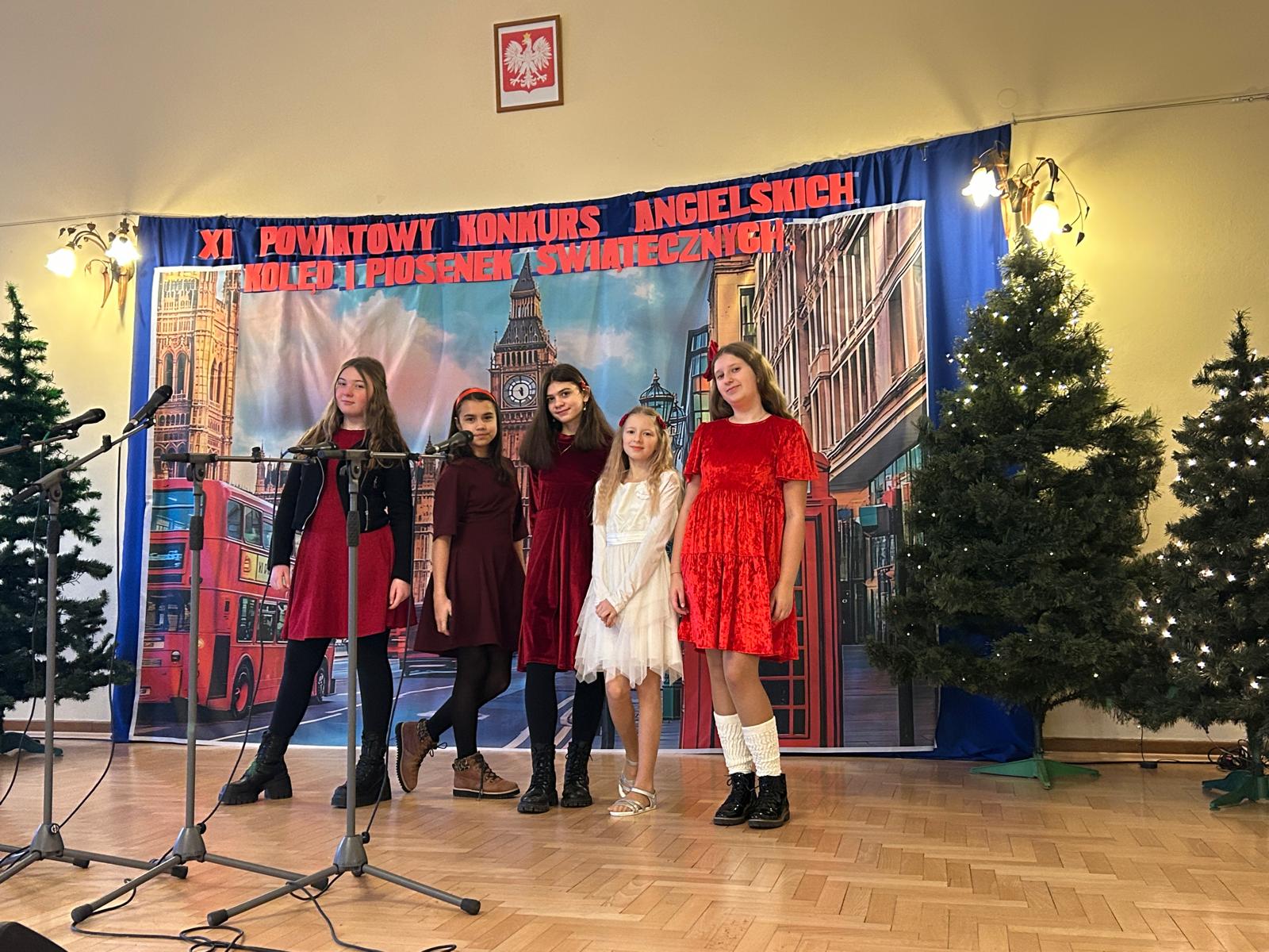 Udział uczennic z klasy 5A w XI Powiatowym Konkursie Angielskich Kolęd i Piosenek Świątecznych w Kostarowcach