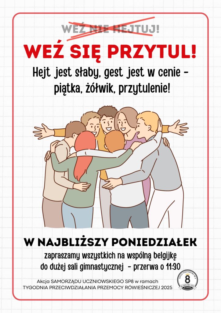 Samorząd Uczniowski zaprasza cała społeczność naszej szkoły do włączenia się w akcję przeciw przemocy rówieśniczej. Pokażmy, że nasza szkoła to miejsce szacunku, wsparcia i życzliwości.