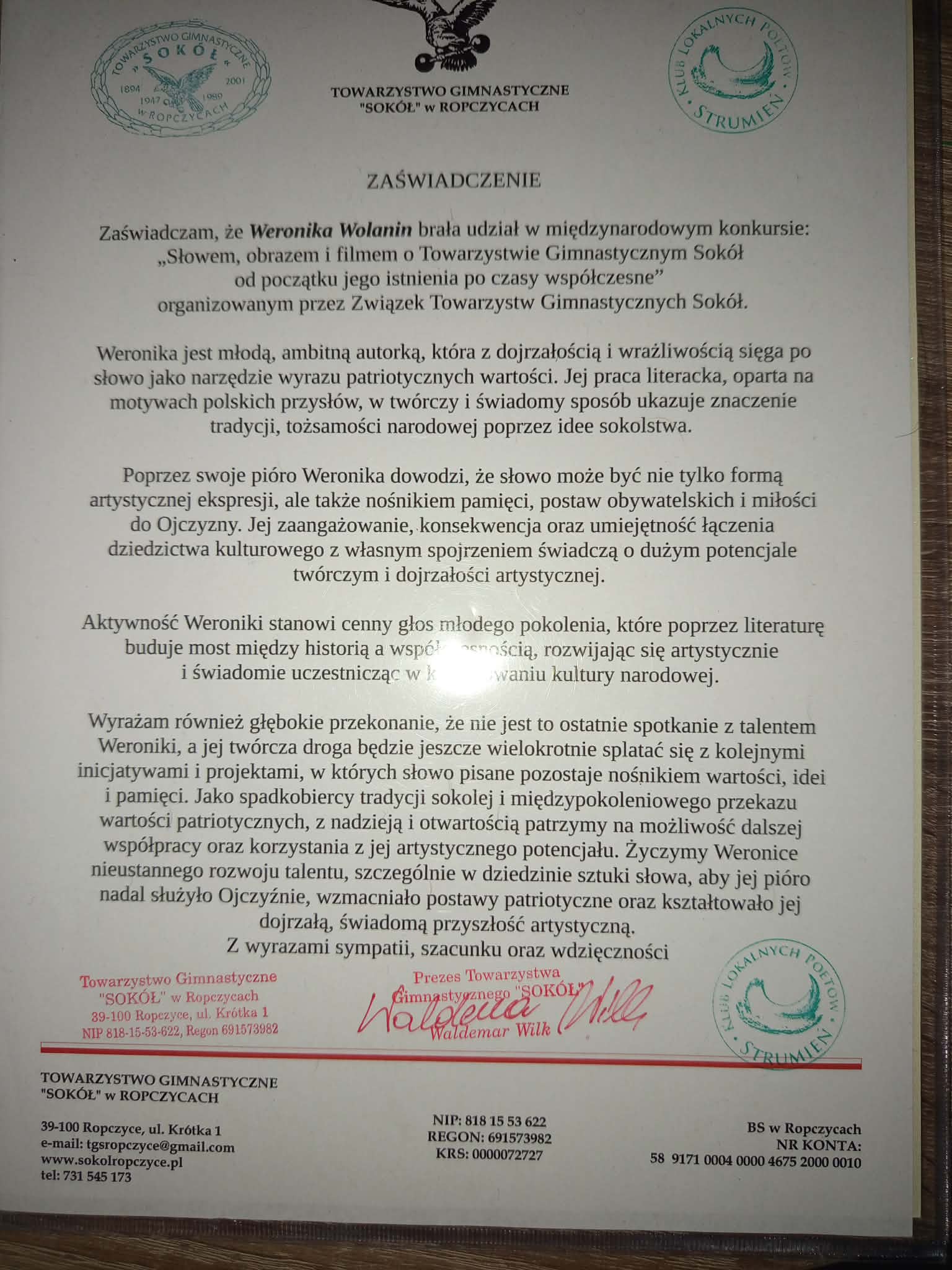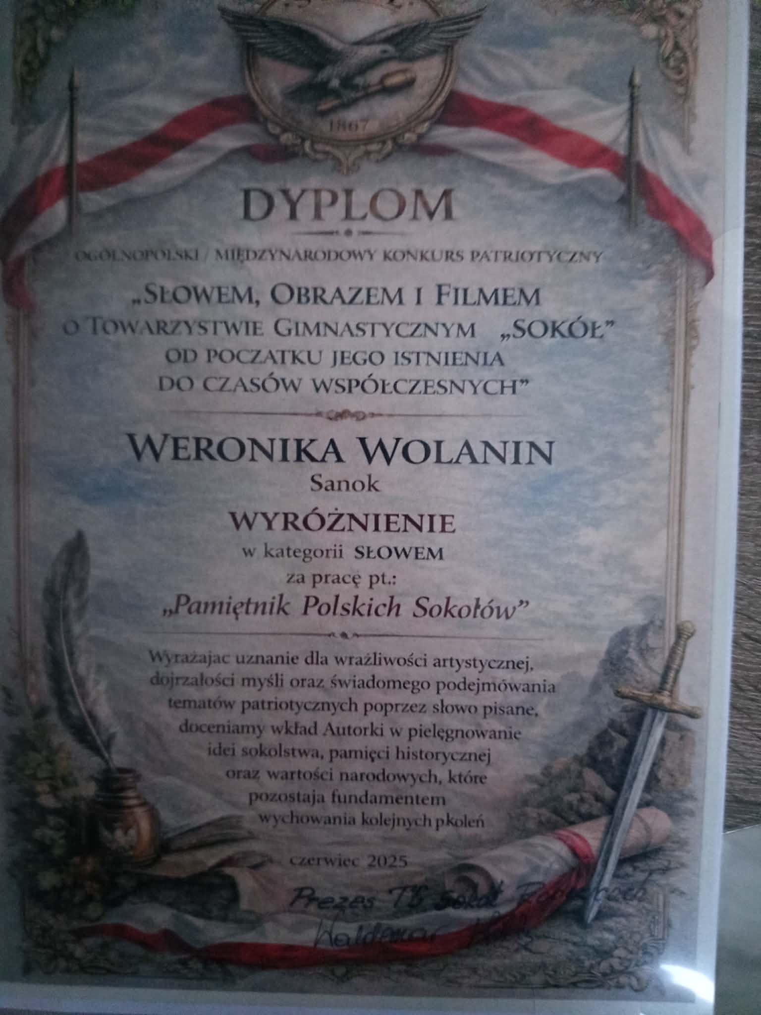 Związek Towarzystw Gimnastycznych „Sokół” zorganizował Międzynarodowy Konkurs o nazwie „Słowem, obrazem i filmem o działaniach Towarzystwa Gimnastycznego Sokół od początku istnienia po czasy współczesne”. Zadaniem uczestników zmagań było napisanie utworu literackiego, namalowanie obrazu lub nakręcenie filmu opowiadającego o działaniach TG „Sokół”. W zmaganiach konkursowych wzięła udział nasza uczennica klasy VII B Weronika Wolanin, która utworem „Pamiętnik Polskich Sokołów”, została wyróżniona w tym konkursie w kategorii literatura.