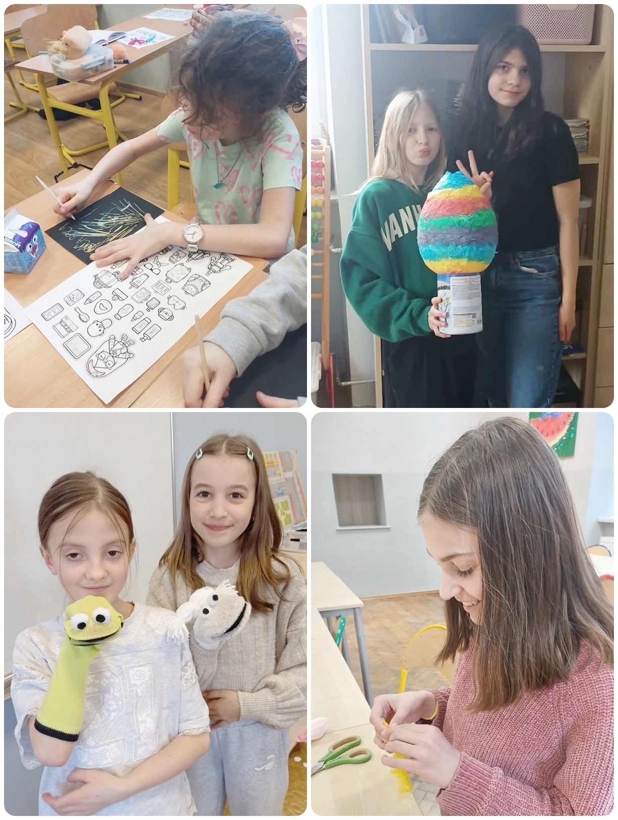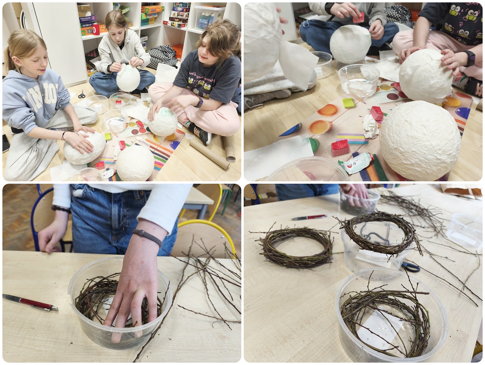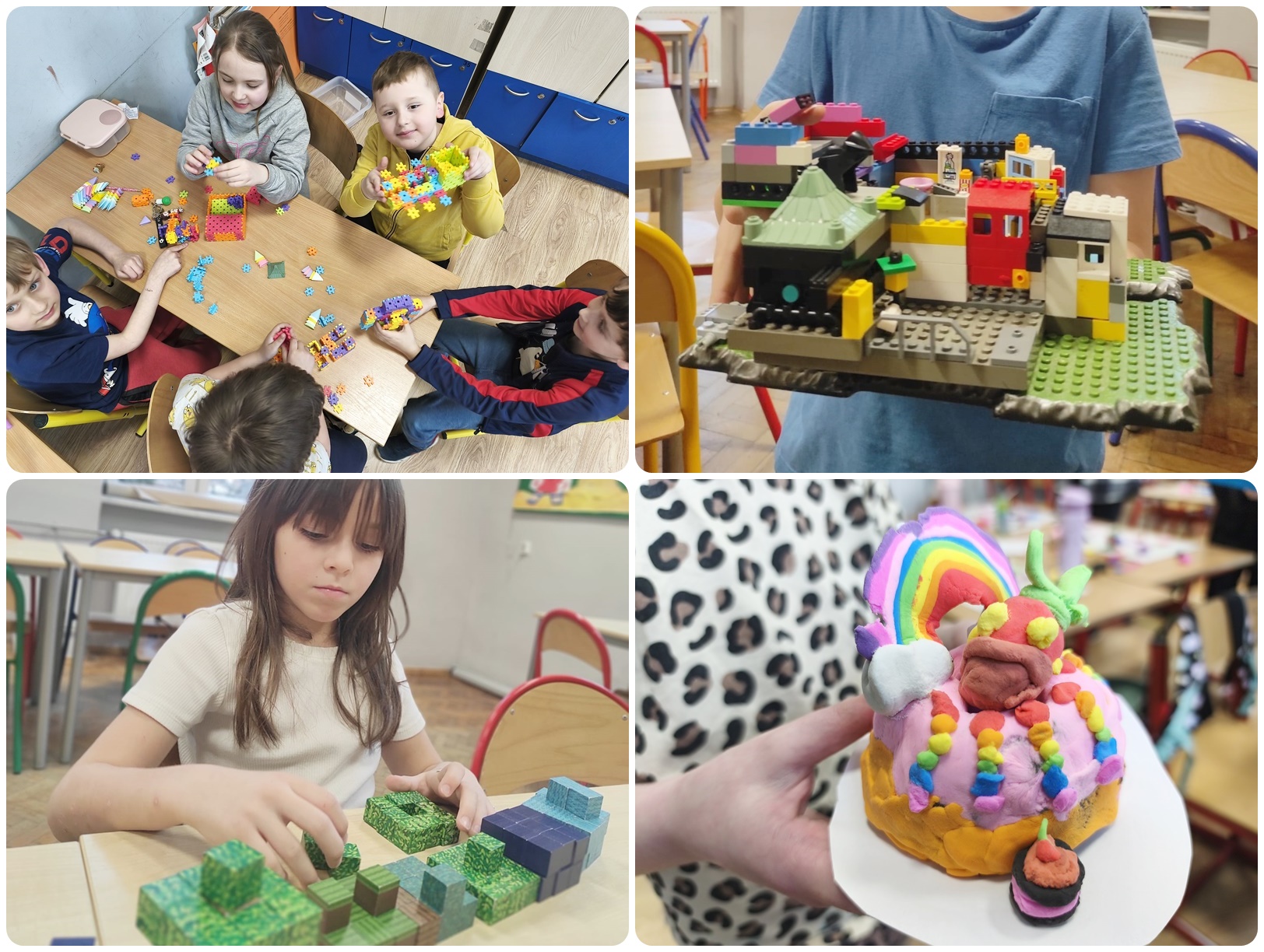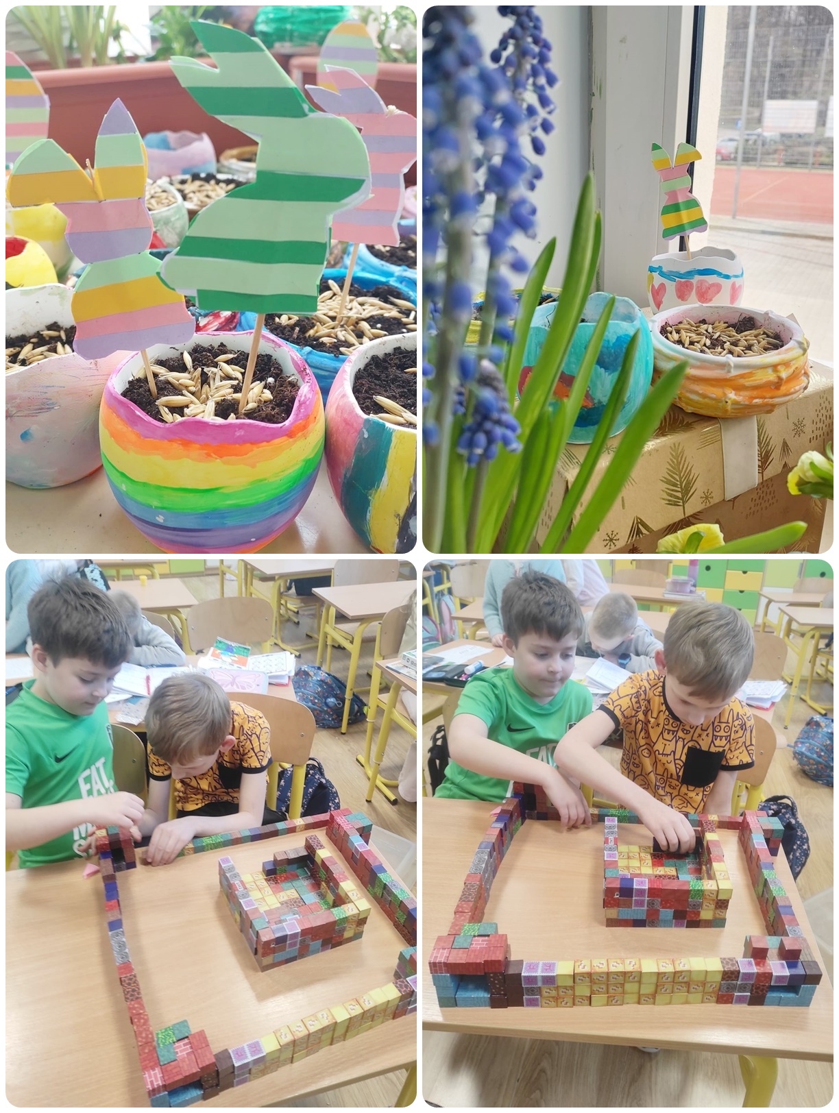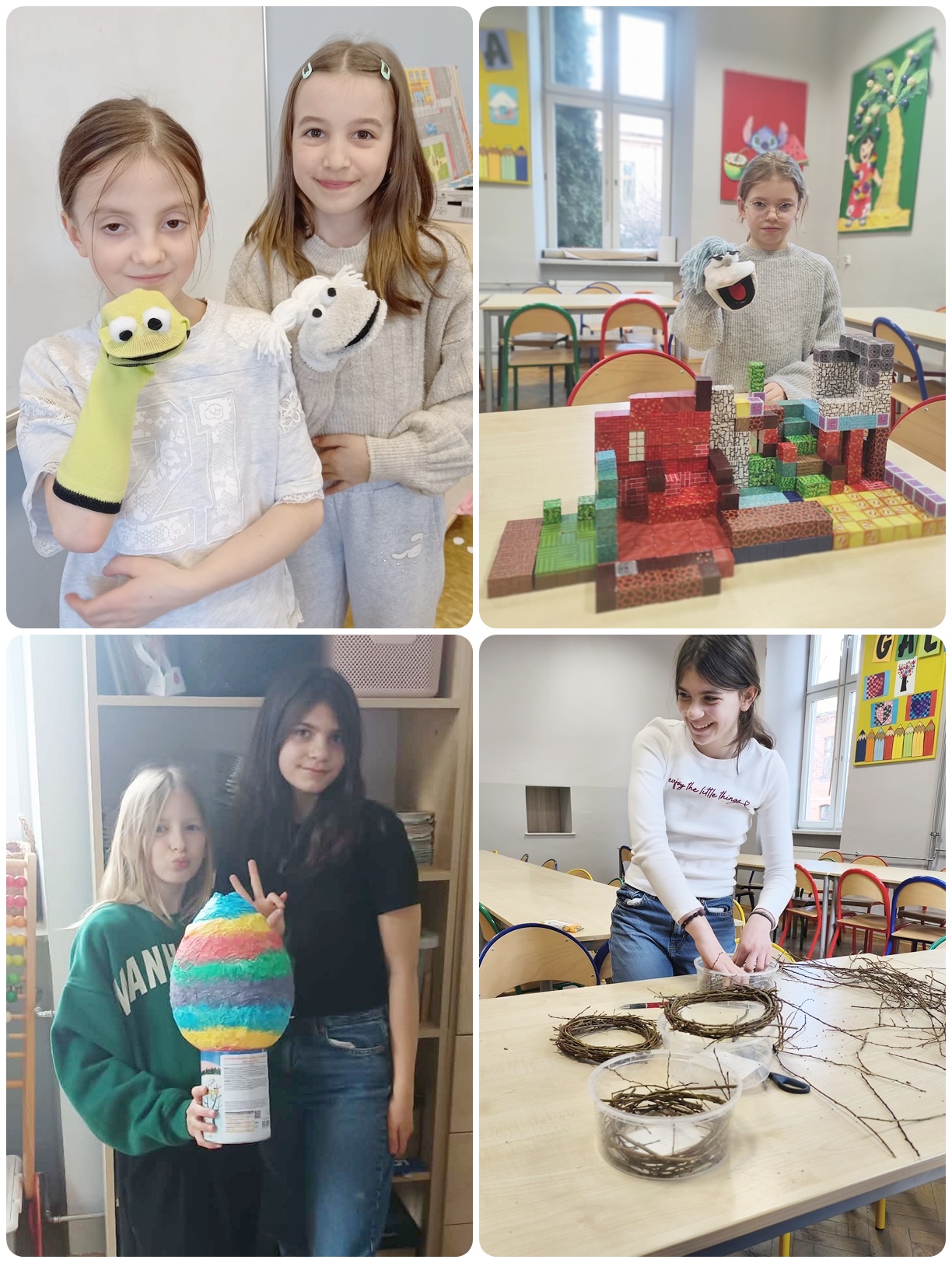 Nie zabrakło także twórczych zabaw, działań usprawniających małą motorykę, gier planszowych i ruchowych oraz wspólnego spędzania czasu w koleżeńskich grupach. W ramach przygotowań do Świąt Wielkanocnych dzieci siały owies i wykonywały świąteczne dekoracje.