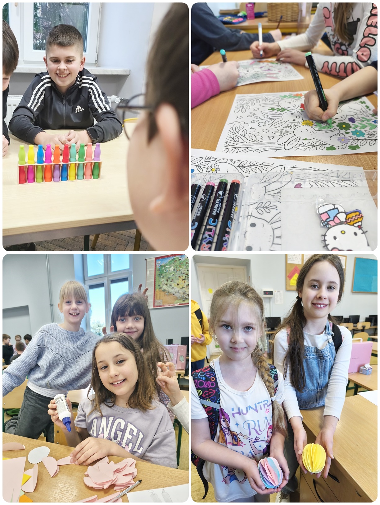 Marzec w naszej świetlicy upłynął w radosnej, wiosennej atmosferze. Dzieci z zaangażowaniem uczestniczyły w różnorodnych aktywnościach inspirowanych budzącą się do życia przyrodą – tworzyły kolorowe prace plastyczne, poznawały wiosenne wiersze, bajki i piosenki oraz rozwiązywały łamigłówki, krzyżówki i kodowanki rozwijające logiczne myślenie.
